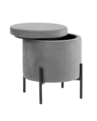 Лаконичный круглый пуф на металлических ножках. Мягкая обивка выполнена из износостойкого велюра, тактильно приятный и долговечный материал. Металлические ножки черного цвета высотой 13 см. выдерживают нагрузку до 80 кг. Подпятники в основании ножек делают пуф более устойчивым и предотвращают скольжение. Под сидением имеется ящик для хранения мелочей, крышка полностью съемная. Пуфик станет отличным дополнением для спальни, прихожей или зала.